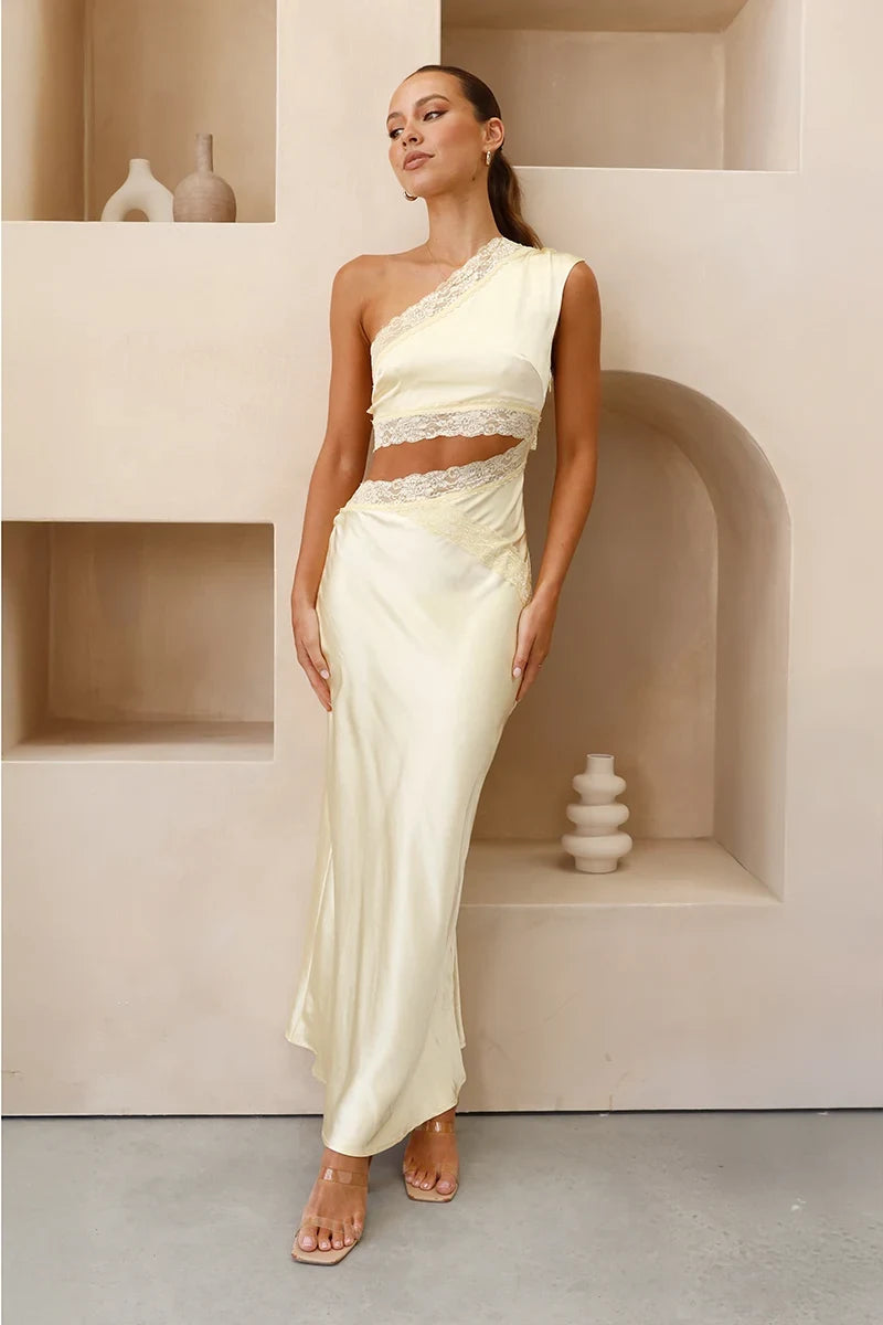 Embrace elegance with our stunning maxi-length dress, featuring a chic one-shoulder design that beautifully frames your figure. The eye-catching side waist cut-out adds a modern twist, ensuring you stand out in any crowd. Delicate lace edge detailing enhances the dress’s sophistication, making it perfect for special occasions.