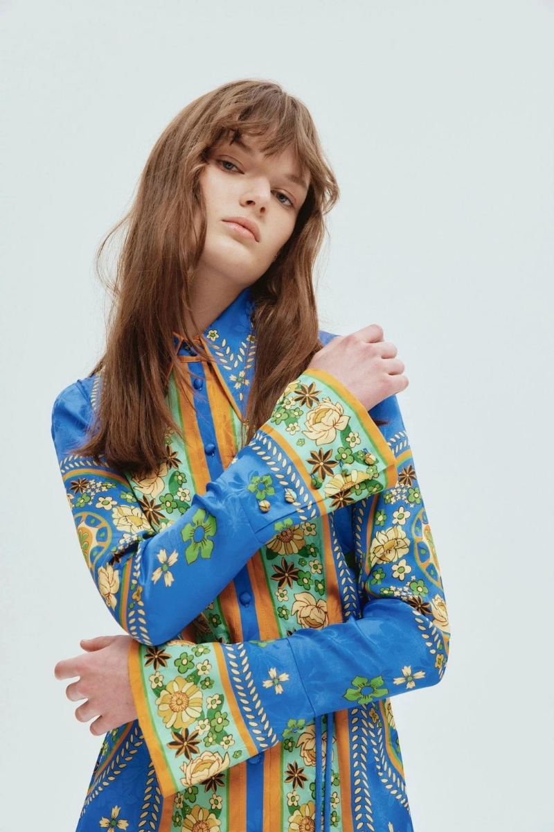 • Design: Long-sleeve dress with a collar, tie detail, and location print