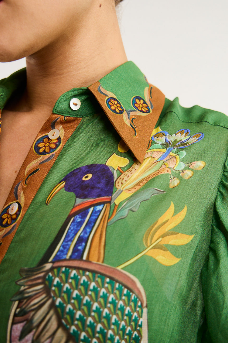 This elegant dress features voluminous lantern sleeves and a classic collared neckline, adding a touch of sophistication to the design. The cinched waist creates a flattering silhouette, while the flowing, wide skirt gives it a graceful, dramatic flair. The vibrant print enhances the dress's bold yet refined look, making it perfect for various occasions.