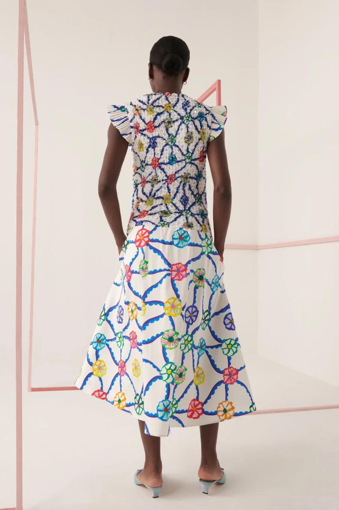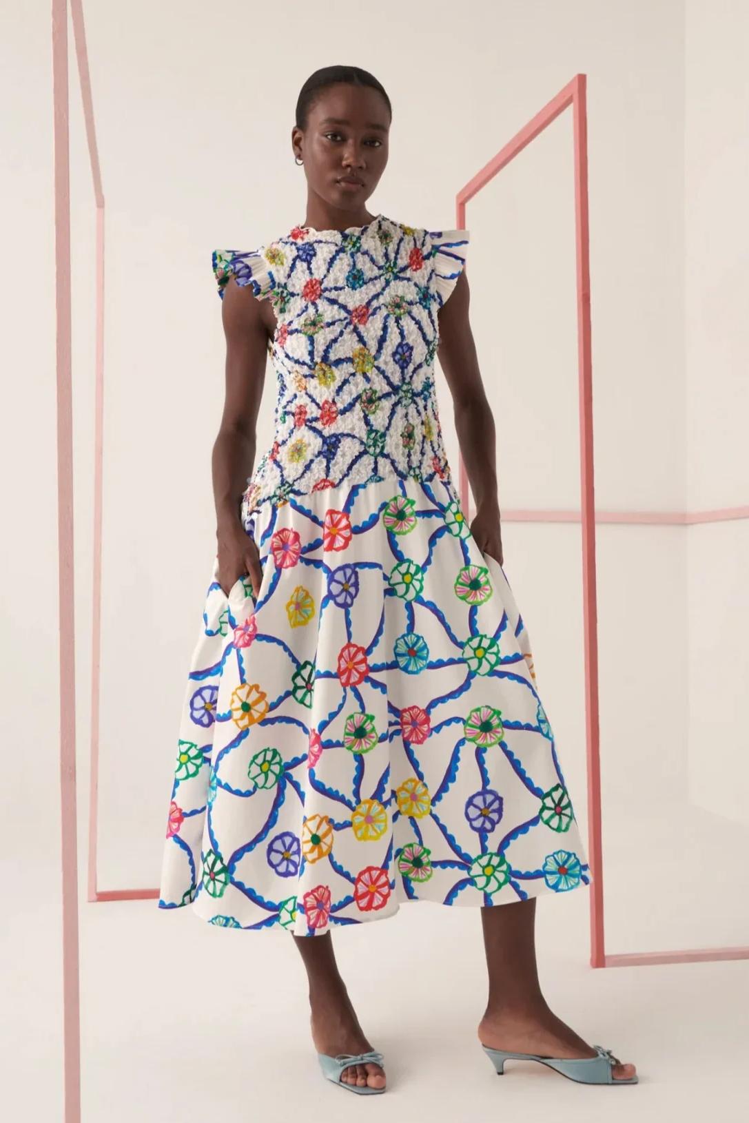 This vibrant midi dress features an all-over colorful floral print on a white base, exuding a fresh and lively vibe. The high neckline is accented with delicate ruffled details on the shoulders, adding a feminine touch. The fitted bodice flows into a flared skirt that moves gracefully with every step, while side pockets offer practicality without compromising style.