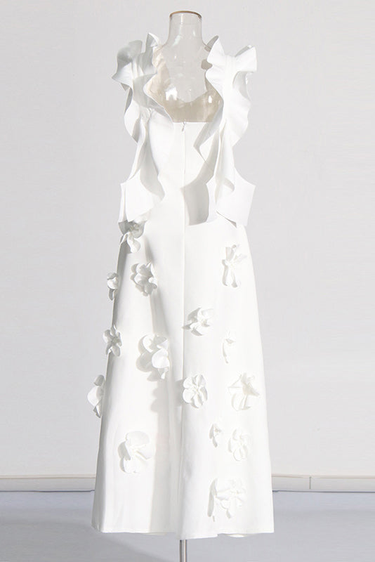 This sleeveless midi dress features a chic ruffled trim and elegant layered design. Its sophisticated silhouette and feminine details make it a perfect choice for a classy, fashionable look.